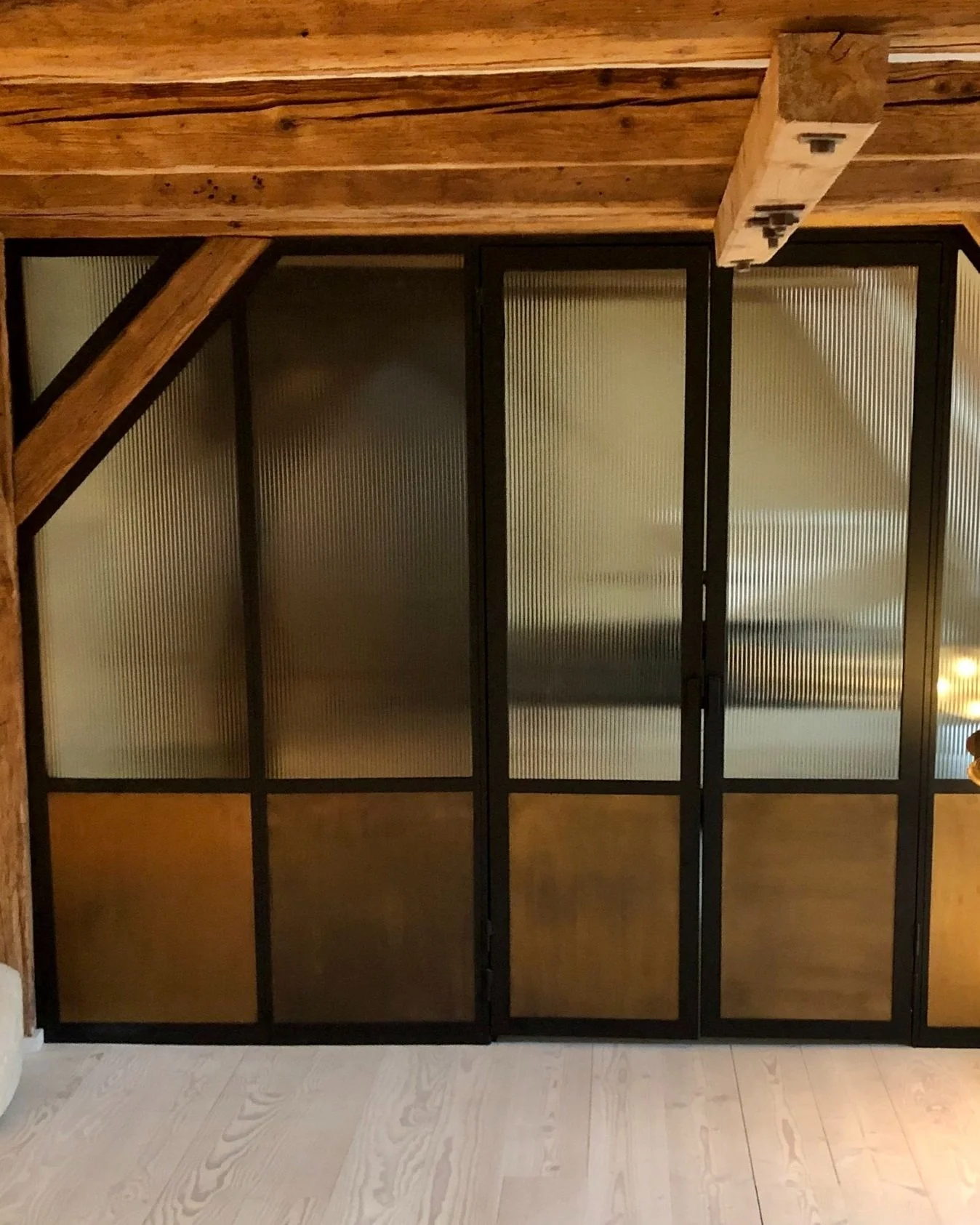 Speciallavet Newyorkervæg med messingdetaljer, hvor det industrielle udtryk får et eksklusivt twist. Kombinationen af sort stål og messing giver et elegant og markant design, der løfter rummet med både karakter og finesse.