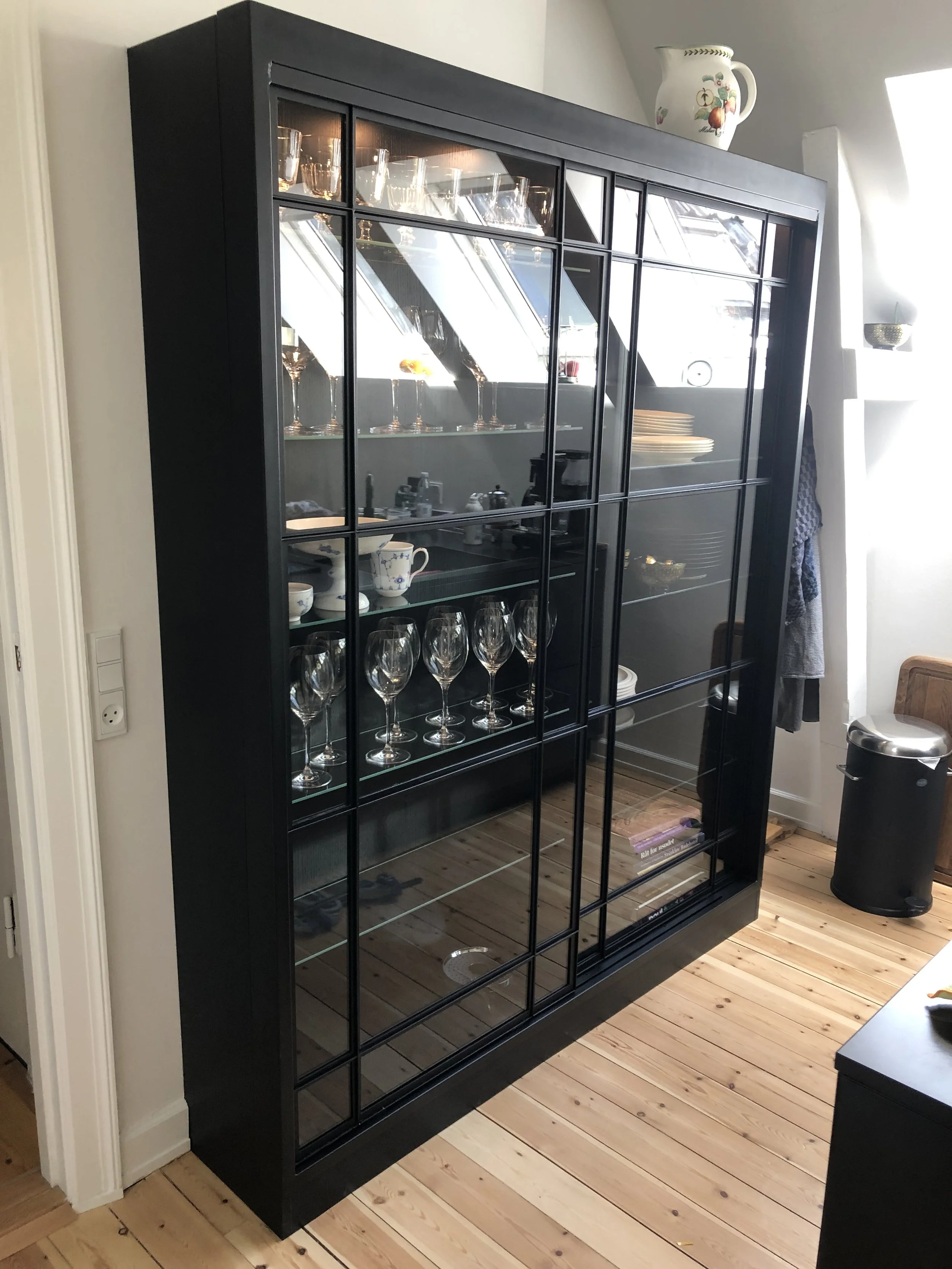 Håndlavet vitrineskab i stål og glas, designet med fokus på rene linjer, høj kvalitet og et elegant, industrielt udtryk. Skabet er skræddersyet til kundens behov og udført med stor omhu i hvert eneste detalje, så det bliver både en funktionel og smuk del af hverdagen.